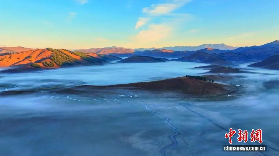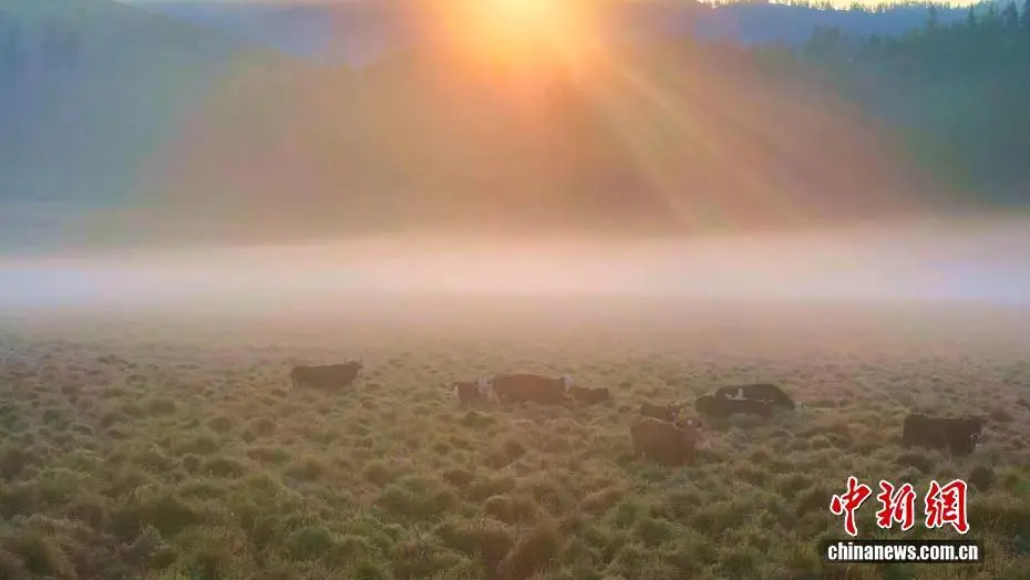 近日,在新疆阿勒泰地区阿禾公路沿途,托勒海特夏牧场清晨现“金色”云海,云雾如轻纱般覆盖在广袤的草原与连绵的山峦之上。阳光穿透云雾,给山丘、森林染上一层金色光辉,令人沉醉。阿勒泰市融媒体中心供图