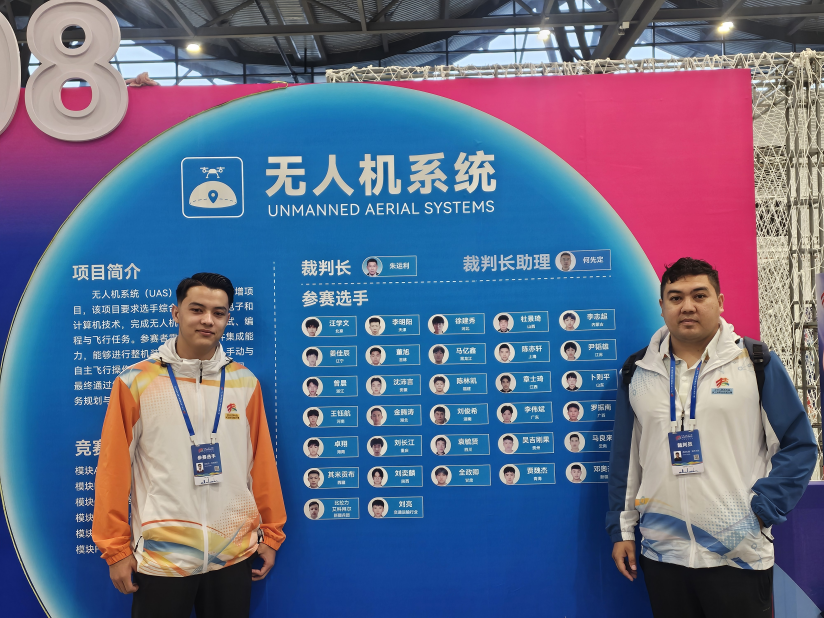 无人机系统赛项裁判西尔扎提·阿不力孜老师、无人机系统赛项选手比拉力·艾科拜尔同学赛场合影