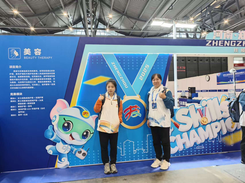 美容赛项裁判杨娜老师、美容赛项选手张鸿敏同学赛场合影