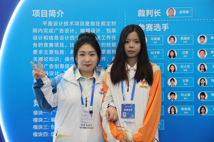 平面设计技术赛项裁判安永娟老师、平面设计技术赛项选手马雯轩同学赛场合影
