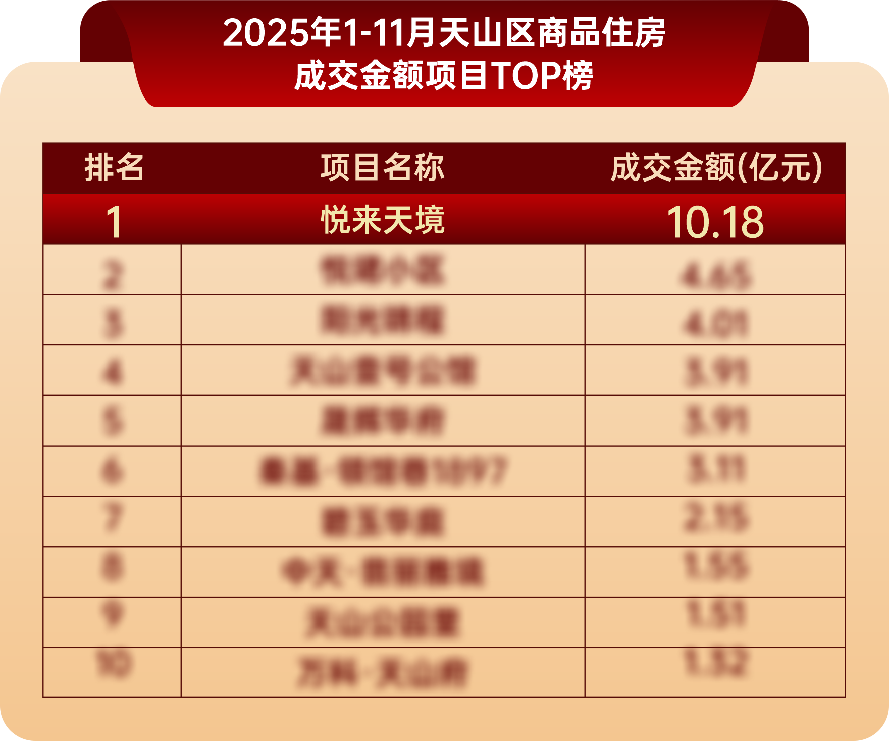 01 从“天山TOP1”到“百万壕礼” 悦来·天境诚意满满回馈全疆 为回馈全城厚爱,悦来·天境特别推出 “百万壕礼,感恩全疆”年终回馈计划,礼遇全城。 瓜分百万壕奖: 即日起累计完成新增认购并签约的前120位客户以及对应房源推荐的经纪人/老业主/全民推荐人,均可参与 “100万现金+iPhone 17 Pro Max” 重磅抽奖。 成交送豪配家电:即日起,认购并按时签约的客户尊享85寸液晶电视一台 02 约563亩五星级酒店式高定生活大城 遥遥领先的天山顶流红盘 悦来·天境1-11月签约以单盘住宅713套,合计销售约10.18亿,荣获全市第三、天山区断档领先第一、天山区市占率约48%等荣誉,天山每卖2套房子,就有1套悦来·天境。